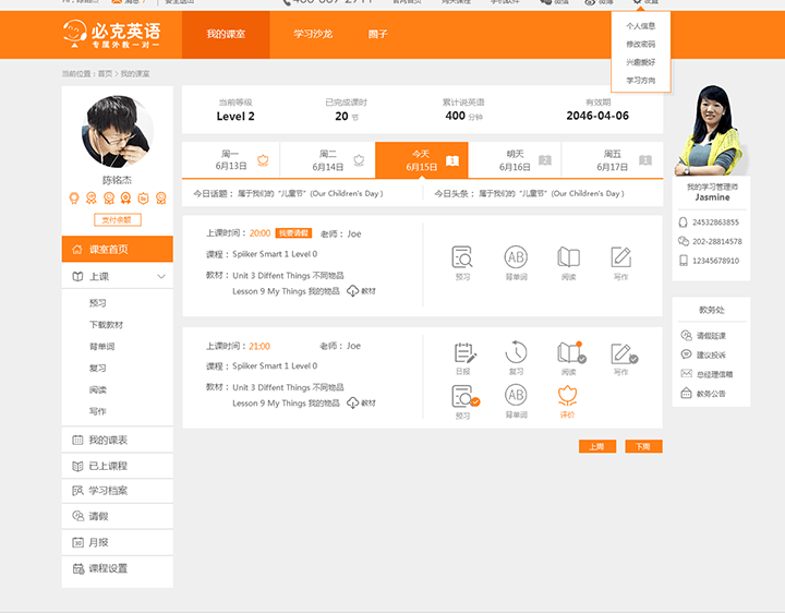 通常必克英语的上课流程为:预习--1对1专属听说课--课后日报查看--课后练习--阅读课--写作课--阅读写作课后批复查看。整个过程都可以在“我的课室”中轻松进行: