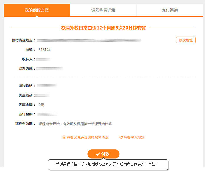 在“购买课程”-“我的课程方案”中先查看不同课程套餐,选择好套餐并通过套餐下方的“付款”按钮即可进入该课程的支付流程。
